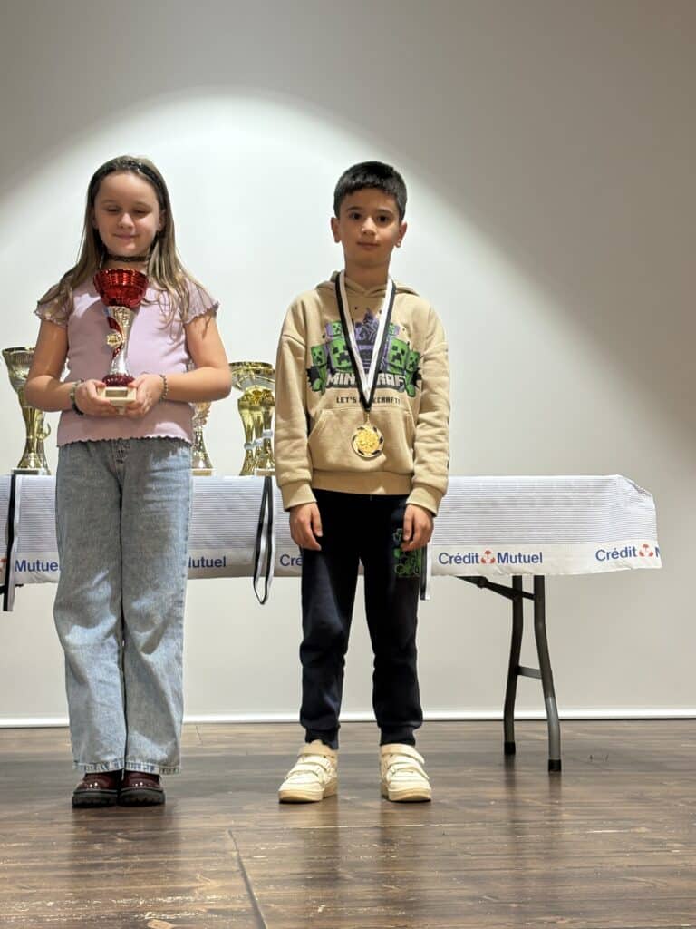 En U10 (poussins), découverte prometteuse également pour Luca, avec 4/9, de belles parties jouées, des tirages difficiles dans les premières rondes, et des émotions au cours des 3 jours, toujours avec un état d’esprit irréprochable. Vivement l’année prochaine !