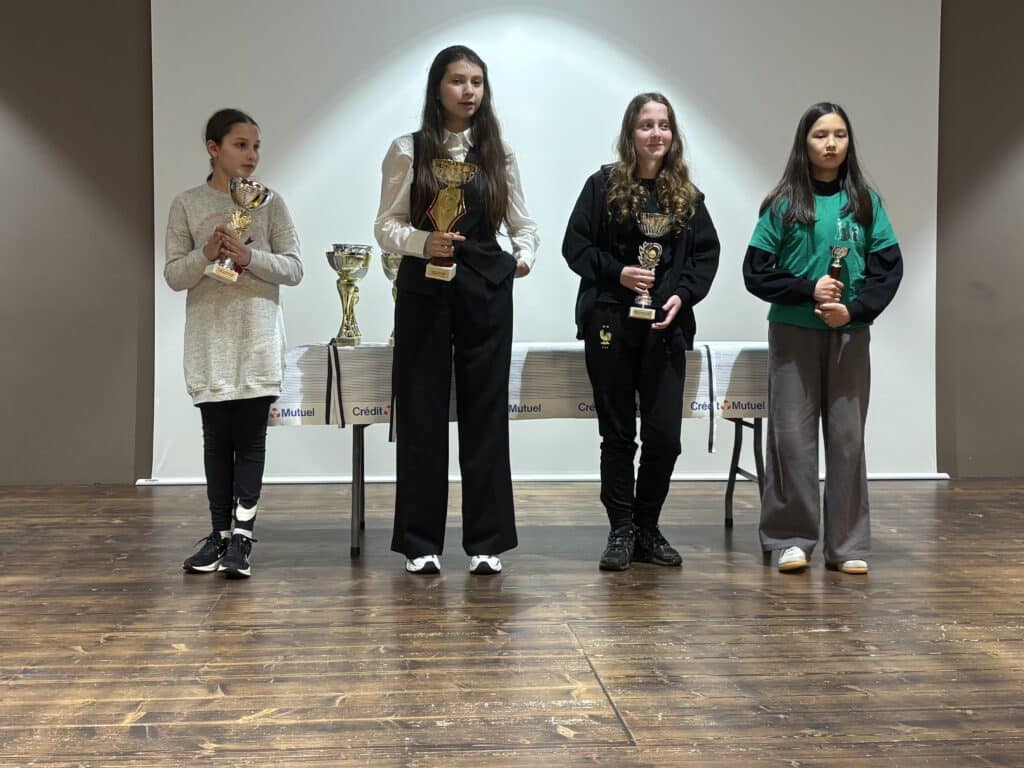 Soulignons la 1ère place féminine et qualification de Minh-Anh Moret, la fille de notre entraîneur Vincent, du club d’Echecs et Max et qui vient parfois se joindre à nos cours du samedi : bravo à elle !