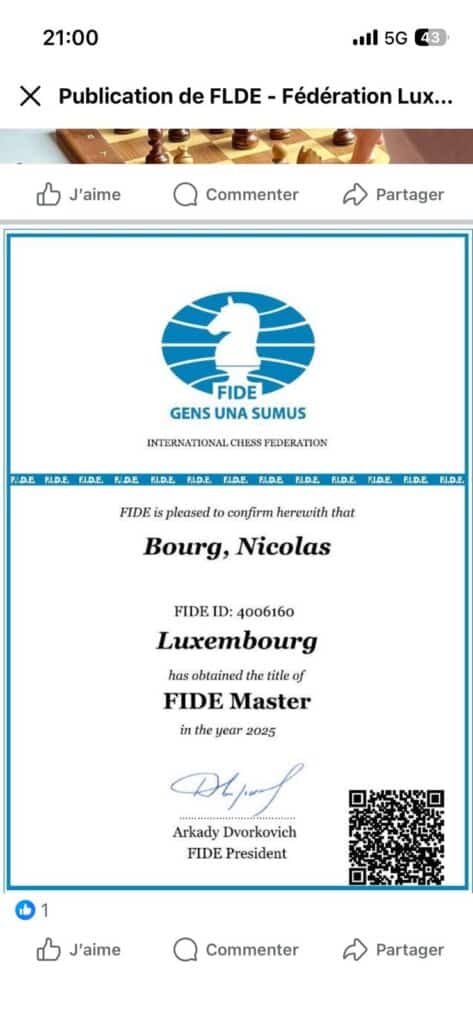 pour son remarquable parcours lors du tournoi d’échecs à Rhodes, en Grèce .lors du championnat d’Europe des Clubs Avec six victoires sur sept parties, il signe une performance exceptionnelle qui lui vaut d’obtenir le titre officiel de Maître FIDE et un gain de 100 points élo au passage. Nicolas est un renfort important cette saison au sein de notre équipe, son plaisir de jouer est communicatif et EFE Metz lui souhaite le meilleur pour obtenir rapidement le titre de Maître International.